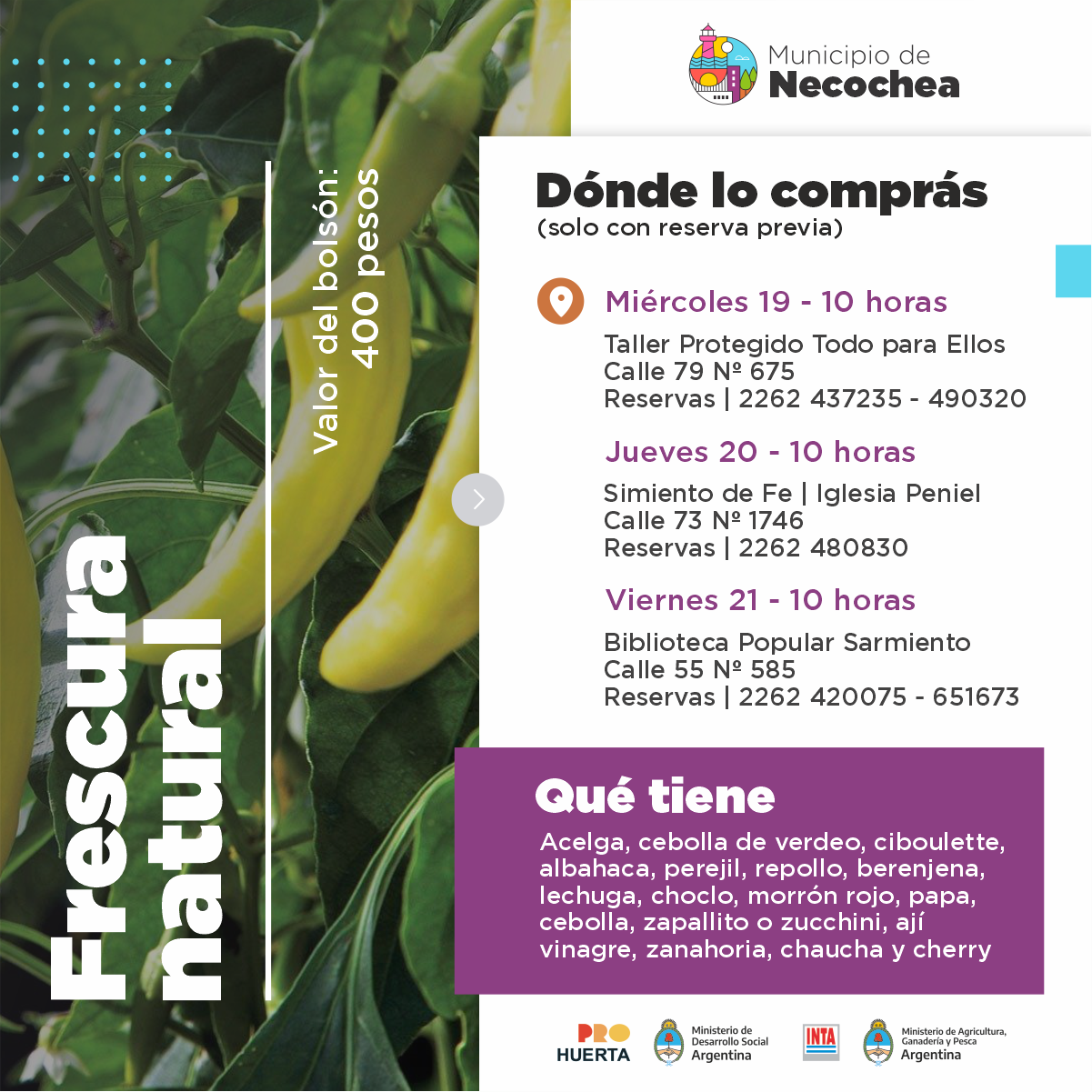 Con un valor de 400 pesos, los bolsones estarán integrados por atados de acelga, cebolla de verdeo, ciboulette, albahaca y perejil; un repollo, dos berenjenas, una planta de lechuga, dos choclos y un morrón rojo; medio kilo de cebollas, zapallitos o zucchinis y zanahorias; un kilo de papas, más cuartos de ajíes vinagre, chauchas y tomates cherry.