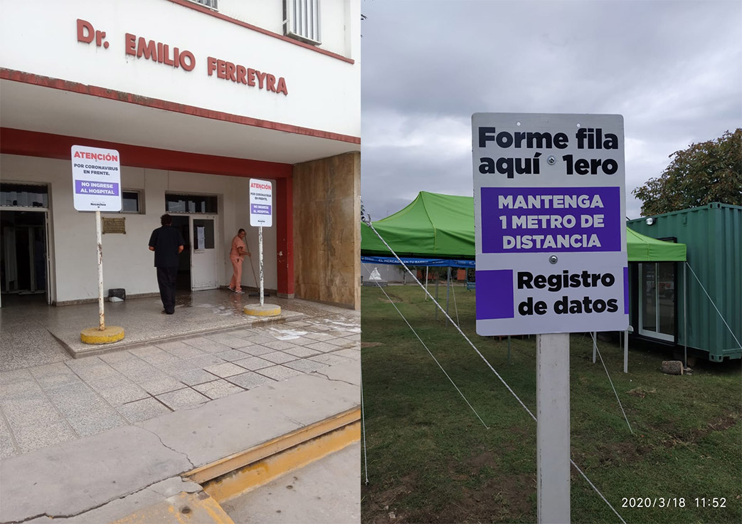 Por otra parte, en inmediaciones del Hospital Municipal “Dr. Emilio Ferreyra”, estuvo trabajando el área de Señalización, dependiente de la Dirección General de Ordenamiento Urbano, instalando cartelería referida a los contenedores sanitarios dispuestos por la comuna para la atención de coronavirus, fuera del nosocomio.
