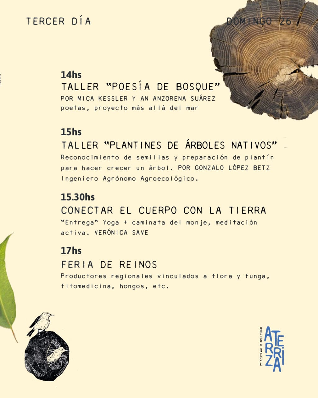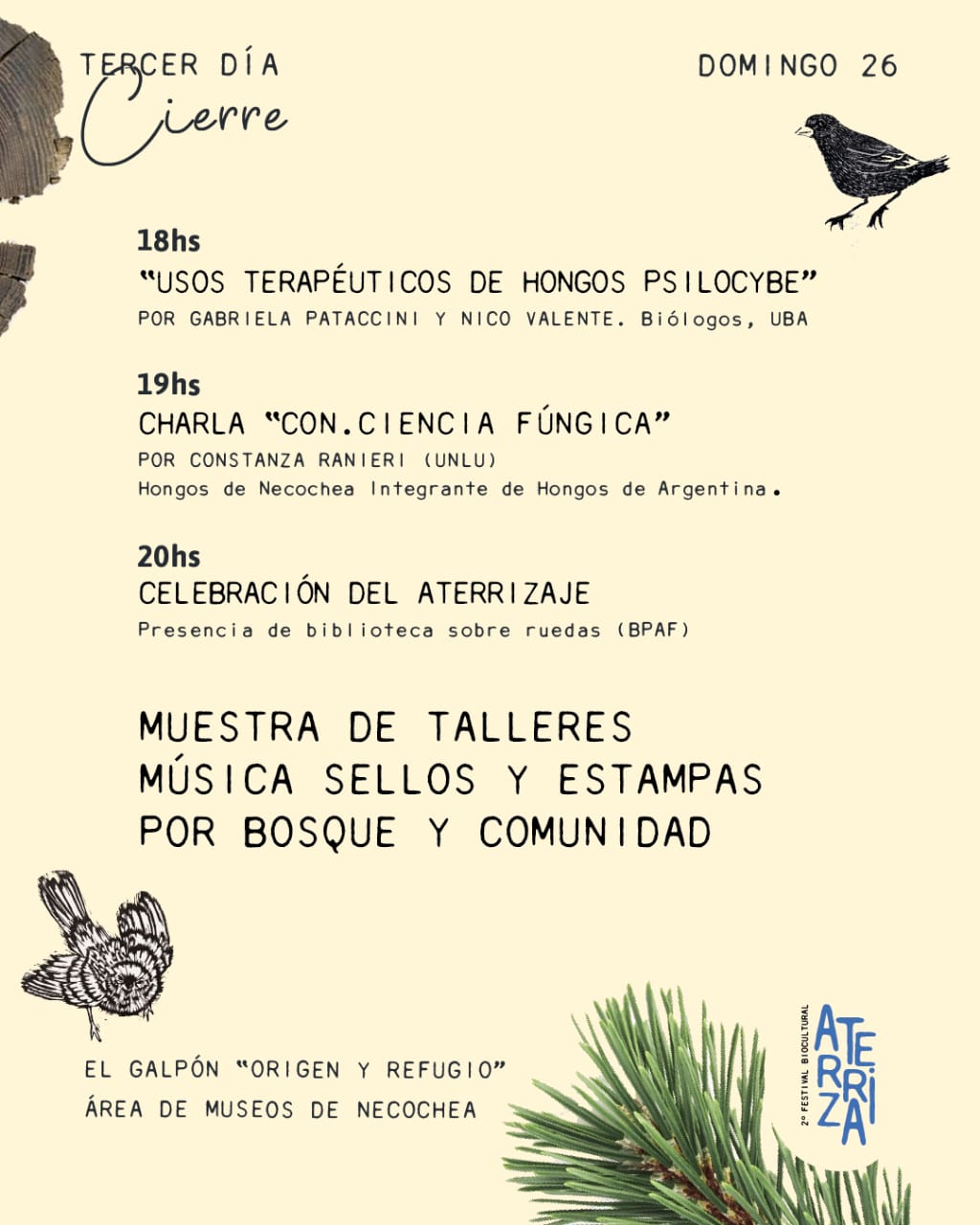 Al finalizar la charla “Con.ciencia fúngica”, música, arte y sorpresas. Recomiendan desde la organización mirar el programa completo en redes sociales ( Instagram y Facebook) para aprovechar las propuestas. También en un link en la bio de su página de Instagram, estará la información ampliada, que también se puede pedir por correo a festivalaterriza@gmail.com. Las actividades son gratuitas con colaboración voluntaria.