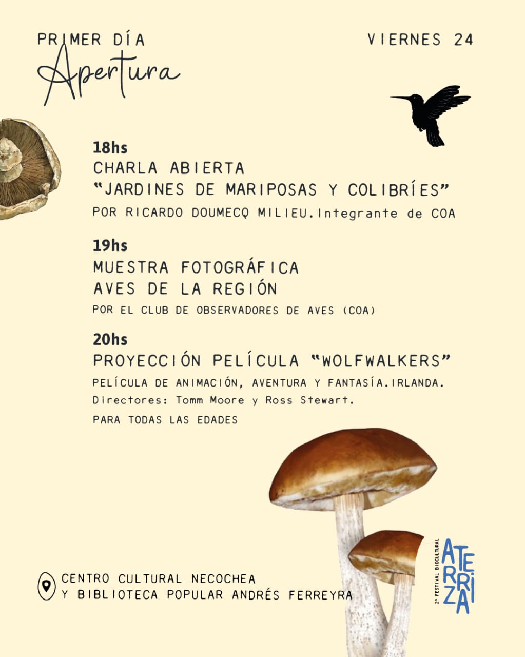 El festival fue declarado de interés municipal, con un amplio programa de actividades que abre este viernes a las 18 en el Centro Cultural de Necochea con la charla “Jardines con mariposas y colibríes”, por Ricardo Doumecq Milieu, una muestra de fotos de aves de la región, por el Club de Observadores de Aves (COA) de Necochea y la proyección de “Wolfwalkers”, una joya de la animación irlandesa, la propuesta del curador del Ciclo de Cine de los viernes, Diego López, para ver en el marco del festival.