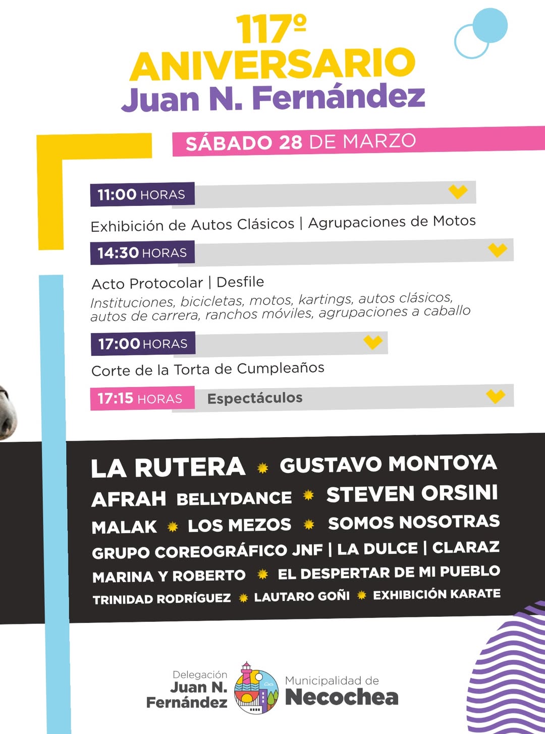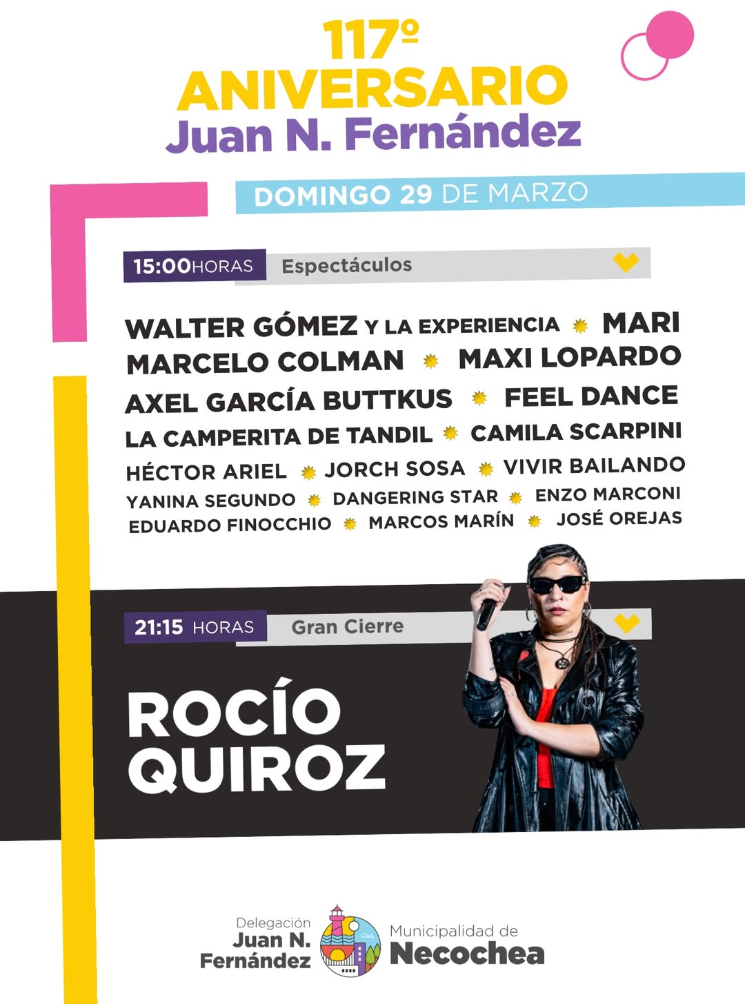 Este sábado 28 de marzo, la localidad de Juan N. Fernández estará cumpliendo 117 años de vida, y además del acto protocolar en el centro del pueblo, se prepara una gran fiesta con torta de cumpleaños, desfile institucional y una doble jornada repleta de espectáculos, con el cierre de lujo el domingo, a cargo de la reconocida artista nacional, Rocío Quiroz.