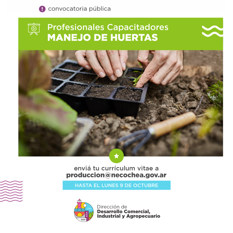 La Secretaría de Turismo y Desarrollo Productivo de la Municipalidad de Necochea, a través de su Dirección de Desarrollo Comercial, Industrial y Agropecuario, se encuentra en la búsqueda de profesionales para el dictado de talleres en manejo de huertas, capacitaciones que estarán dirigidas a distintos sectores de la comunidad.