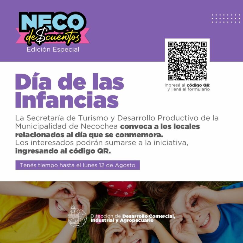 “Si tenés un comercio relacionado al día que se conmemora y te gustaría adherirte completa el formulario”, solicitaron desde el área, llamando a las firmas interesadas a completar el formulario de inscripción escaneando el código QR que aparece en la gráfica publicitaria del evento o ingresando al link https://bit.ly/NecoDescuentosNiñez.