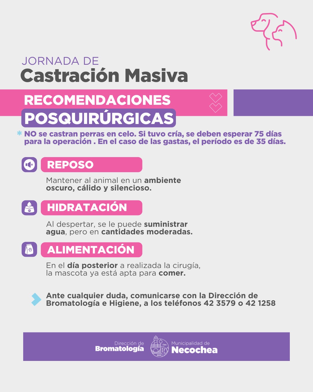 La Municipalidad de Necochea, a través de la Dirección de Bromatología e Higiene, informa que el próximo sábado 11 de abril se llevará a cabo una nueva jornada de castración masiva de mascotas, en el marco de las políticas públicas destinadas a promover la tenencia responsable.
