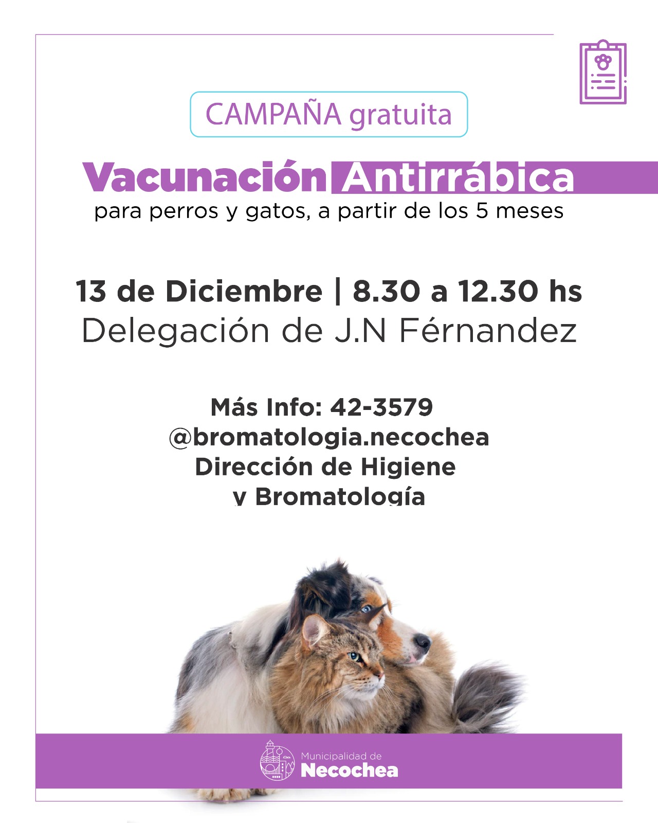 La Dirección de Bromatología e Higiene anunció una nueva jornada de vacunación antirrábica en el marco de la campaña gratuita que realiza en los distintos barrios y localidades del distrito de manera itinerante. Esta vez, el operativo tendrá sede en la Delegación Municipal de Juan N. Fernández, el próximo viernes 13 de diciembre.