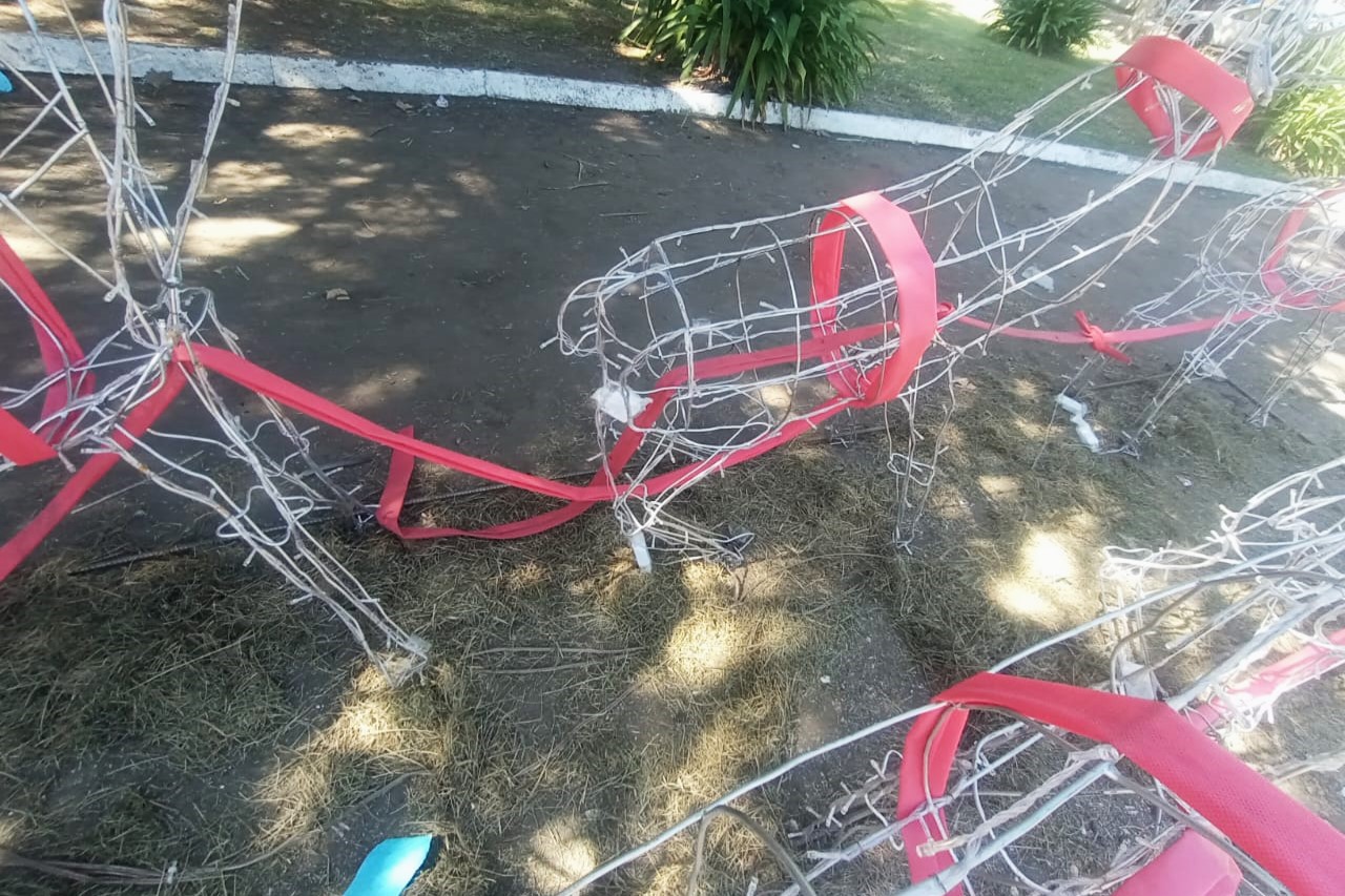 El lamentable acontecimiento se dio este domingo, cuando personas aun no identificadas quitaron la señalética de madera, desoldaron y rompieron los renos hechos con hierro que tiran el trineo, desgarraron la bolsa de regalos de Papá Noel y desprendieron una tira de luces del propio árbol.