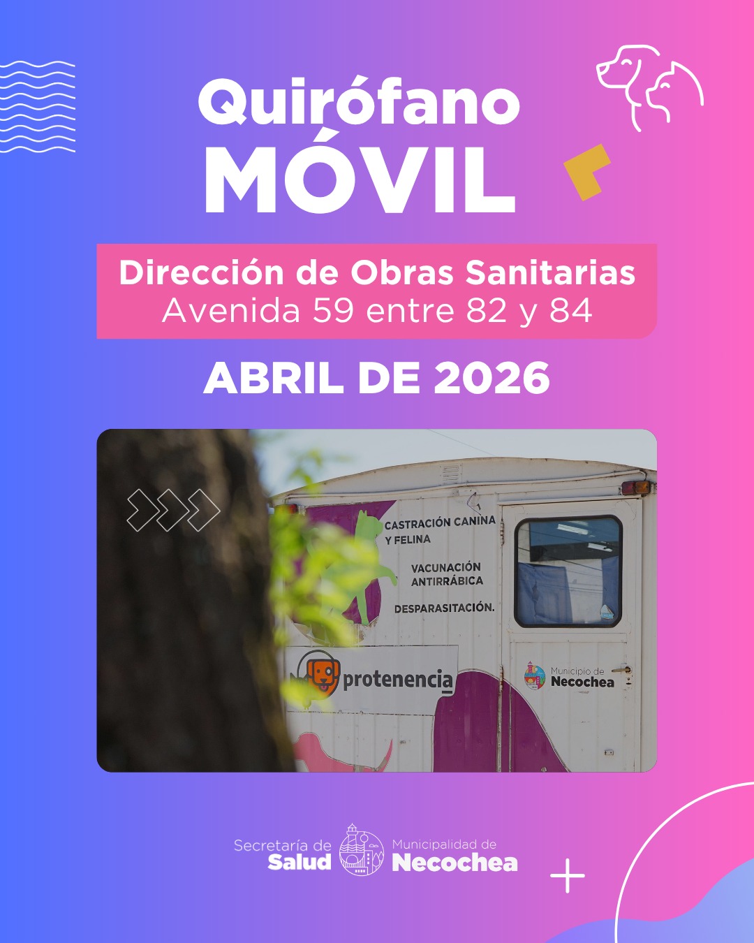 La Dirección de Bromatología e Higiene, confirmó que, así como durante todo el mes de marzo, el Quirófano Móvil de castración gratuita de mascotas atenderá en abril en el sector de Obras Sanitarias, en Av. 59 entre 82 y 84.
