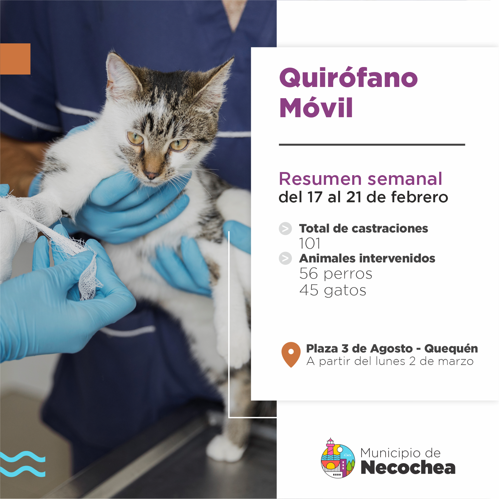 Según los números que dejó el resumen, entre el lunes 17 y el viernes 21 de febrero se operaron 56 perros y 45 gatos. En marzo el programa estará operativo en la Plaza 3 de Agosto de Quequén, con turnos reducidos durante la primera semana de funcionamiento.