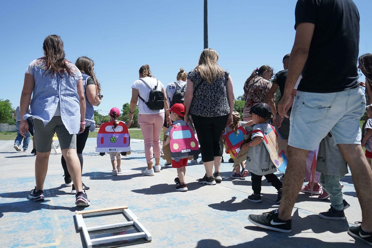 Los pequeños y pequeñas de la sala de dos años -los “más grandes” de la institución- llegaron hacia el espacio público subidos a sus autos de cartón, pintados con mucha dedicación junto a sus familias, y fueron recorriendo un camino que los paseó por las distintas señales de tránsito, adquiriendo a través del juego las primeras nociones del manejo vehicular.