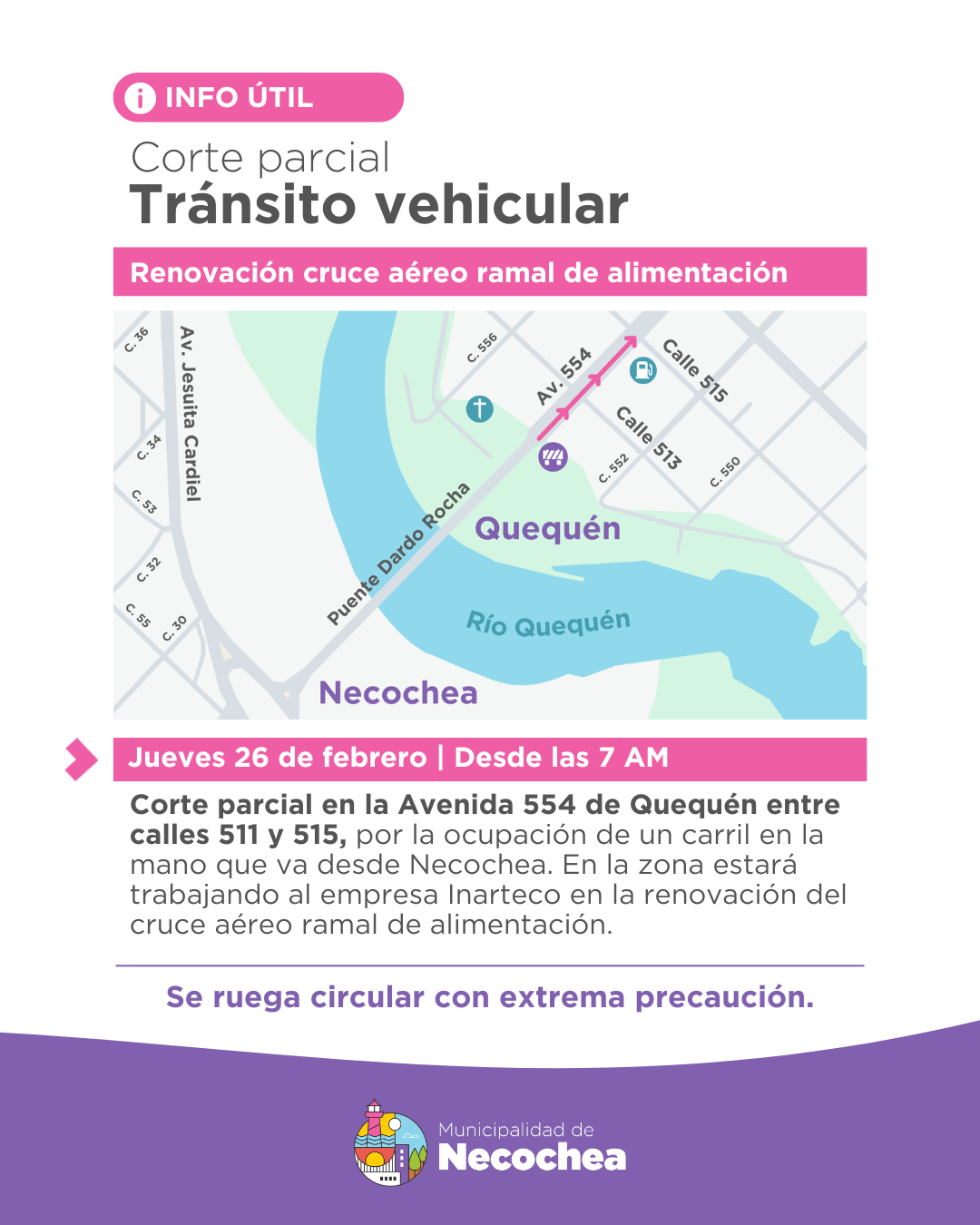 La Municipalidad de Necochea comunica a la población que, debido a la realización de trabajos de infraestructura, se verá afectada la normal circulación vehicular en un sector de la ciudad de Quequén durante la jornada de mañana, jueves 26 de febrero, desde las 7 horas.