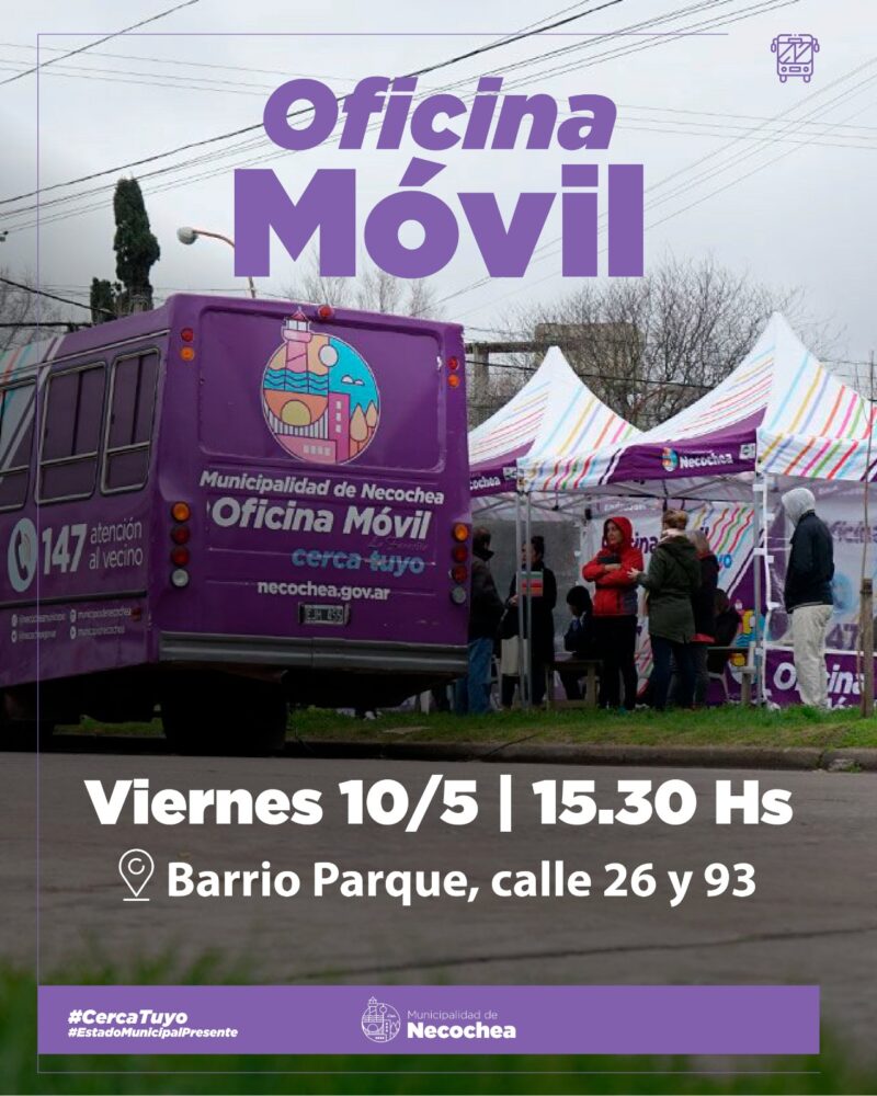 La Oficina Móvil de la Municipalidad de Necochea retomará sus operativos itinerantes en la tarde de este viernes 10 de mayo, cuando llegue a la intersección de calles 26 y 93, en pleno Barrio Parque, para atender las consultas e inquietudes de los y las habitantes del lugar y zonas linderas.