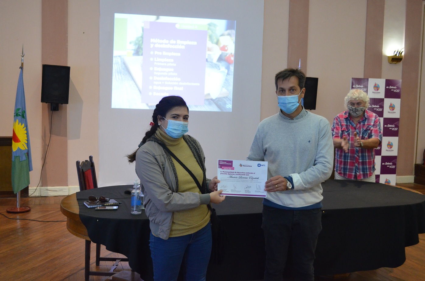 Junto al jefe comunal, hicieron entrega en el Salón de Actos los secretarios de Salud y de Planificación y Desarrollo Productivo, Ruth Kalle y Matías Sierra, respectivamente, y éste último fue quien destacó la realización de un nuevo curso y el dictado del mismo por parte del Dr. José Luis Orofino, de Bromatología e Higiene.