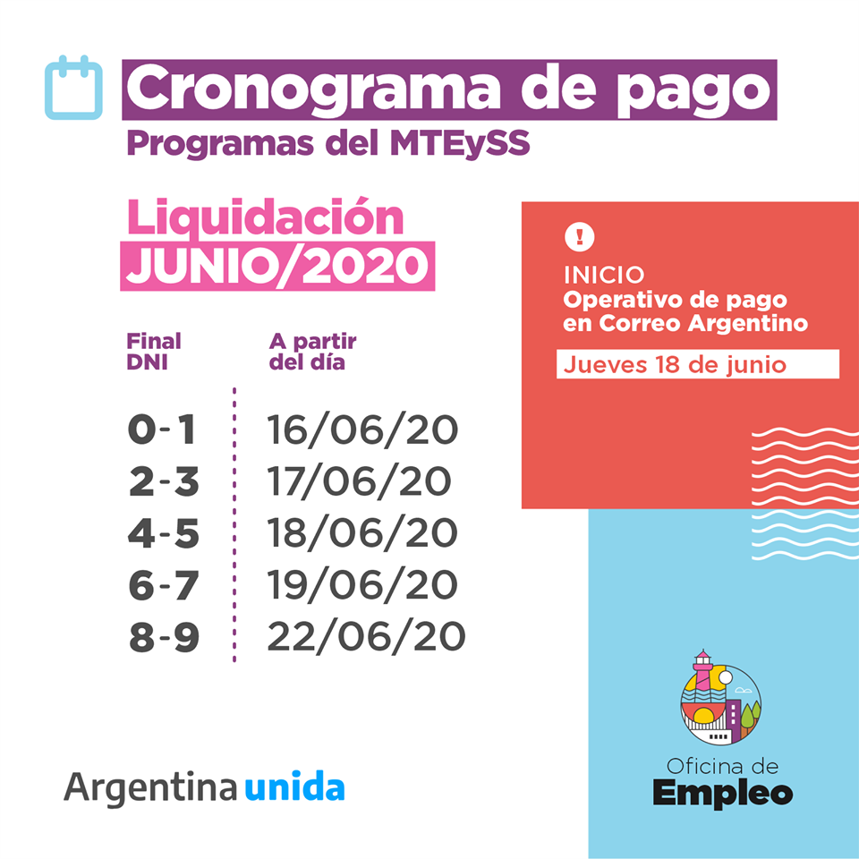 La Oficina de Empleo Municipal informa que, en la mañana de hoy, martes 16, se dará inicio el operativo de pago que liquidará las prestaciones correspondientes al mes de mayo, por los programas el Ministerio de Trabajo, Empleo y Seguridad Social de la Nación