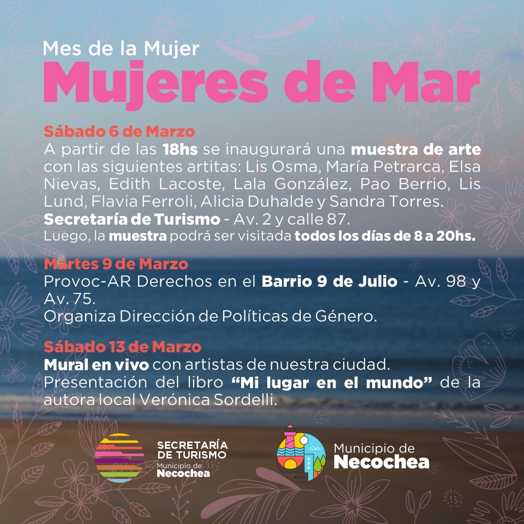 Desde este sábado 6, la Secretaría de Turismo de Necochea junto a las áreas municipales de Desarrollo Humano, Cultura, Educación, Medio Ambiente y Género ofrecerán una variada programación de actividades dentro del ciclo denominado “Mujeres del Mar”, en el marco del Día Internacional de la Mujer, que se conmemora todos los 8 de marzo.