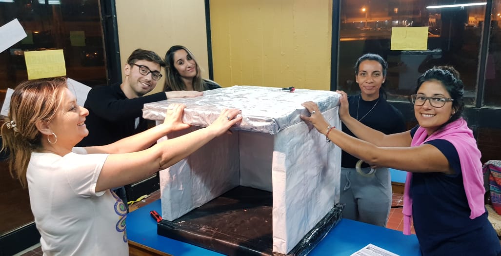 Para esta actividad puntual, el taller consistió en el armado de cuchas sustentables, es decir, casetas que realizaron con una importante cantidad de tetra packs de leche limpios y bolsas vacías de alimento. Cada una de las cuchas, constó de 122 packs reciclados, utilizándose un total de 488 durante la jornada.