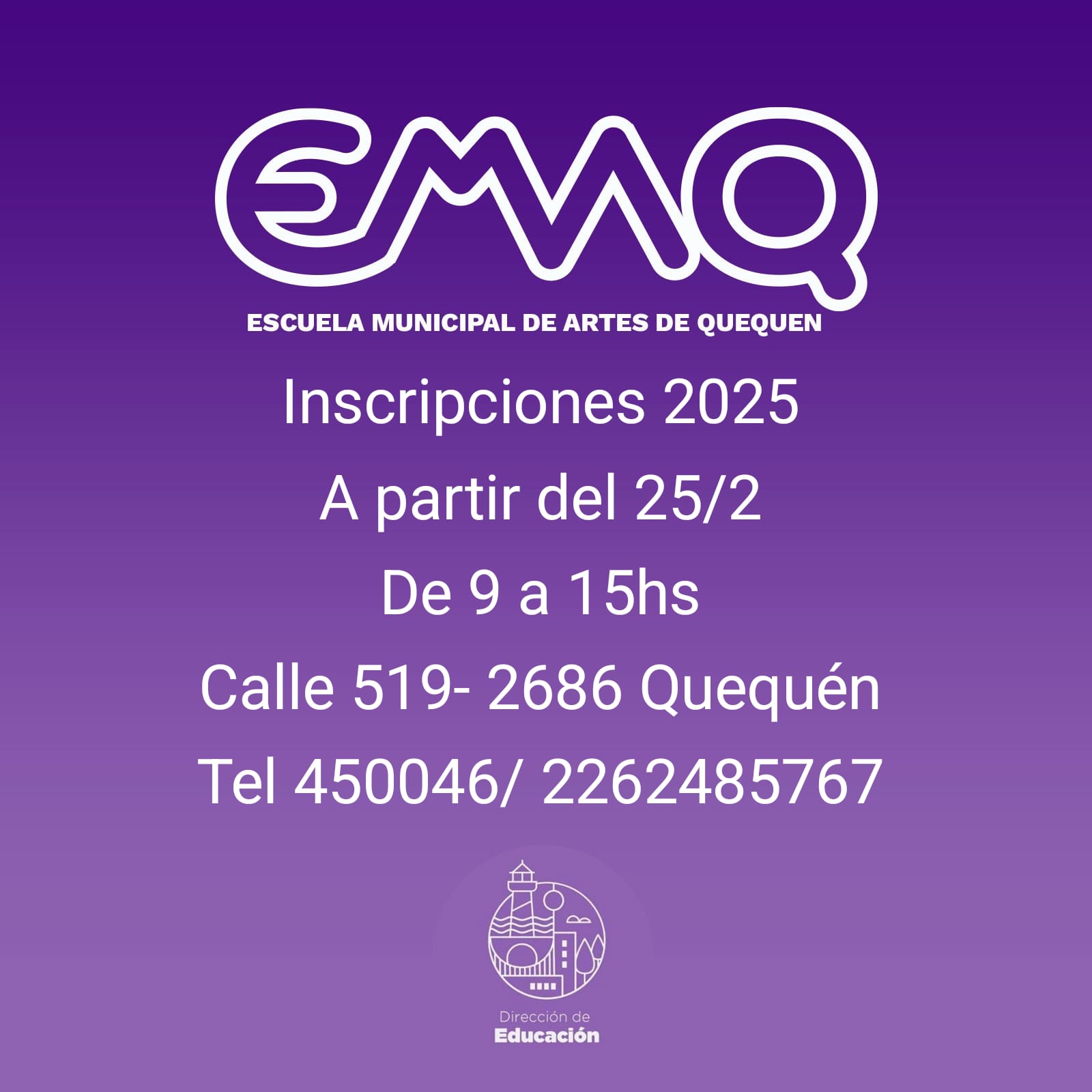 En vistas al inicio del nuevo ciclo, los interesados podrán inscribirse a partir del venidero lunes 25 de febrero en la sede de la EMAQ, en 519 Nº 2670, de 9 a 15 hs.; o bien pueden comunicarse al teléfono 45-0046; entrar al Facebook Escuela de Artes de Quequen o al Instagram @escuelamunicipalartesqqn. Se solicita la fotocopia de DNI del inscripto.