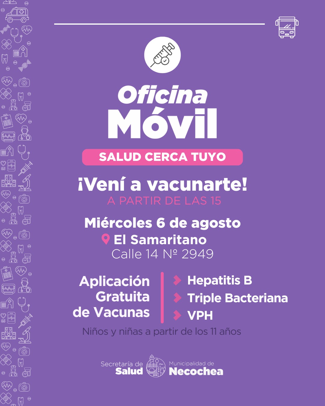 Además, la Oficina Móvil ofrece vacunación para niños y niñas de 11 años, vacunación antirrábica para mascotas, inscripción al botón antipánico y acompañamiento del PAMI para adultos mayores.