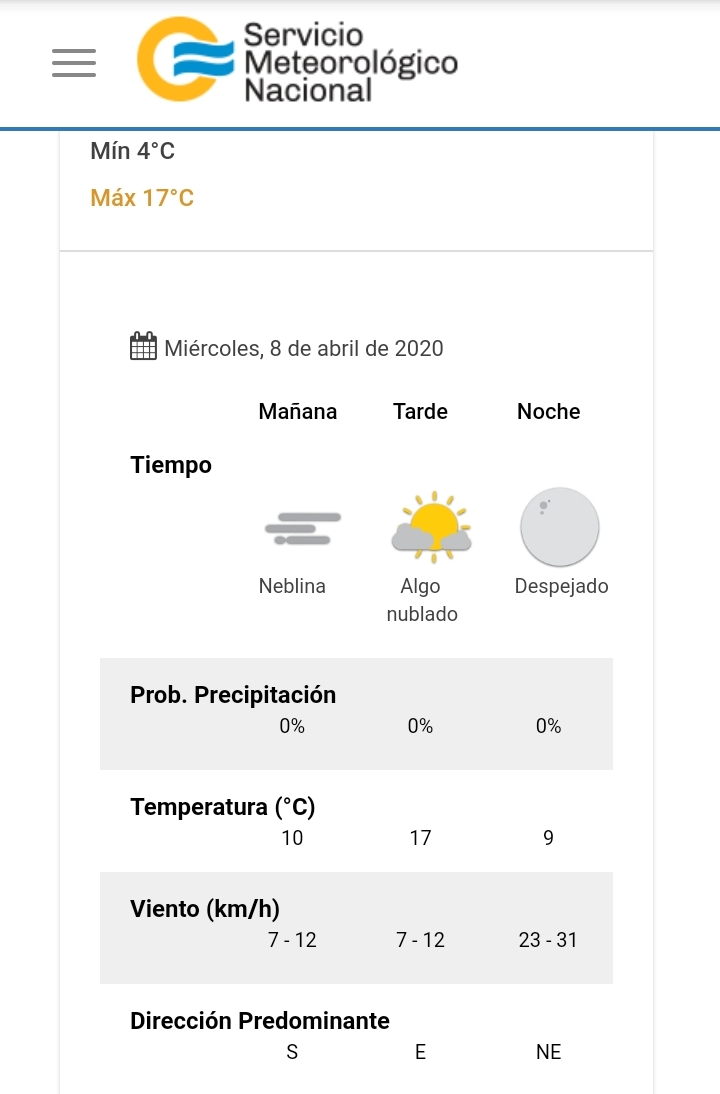 Para hoy, el Servicio Meteorológico Nacional informa neblina por la mañana con una máxima de 17°C, viento del sector sur alrededor de 7 km/h y ráfagas a 30 km/h. Por la tarde, cielo algo nublado con viento del sector este, y por la noche despejado con viento del sector noreste y una temperatura mínima de 4°C.