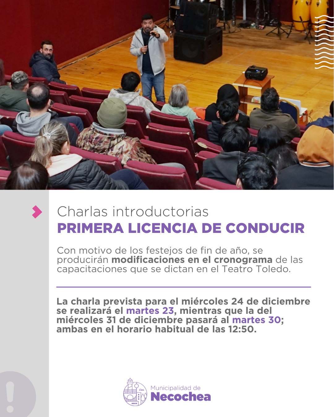Debido a las festividades de Navidad y Año Nuevo, se informa a la comunidad que las charlas introductorias obligatorias para obtener la primera licencia de conducir sufrirán cambios en sus días de realización durante las últimas dos semanas de diciembre.