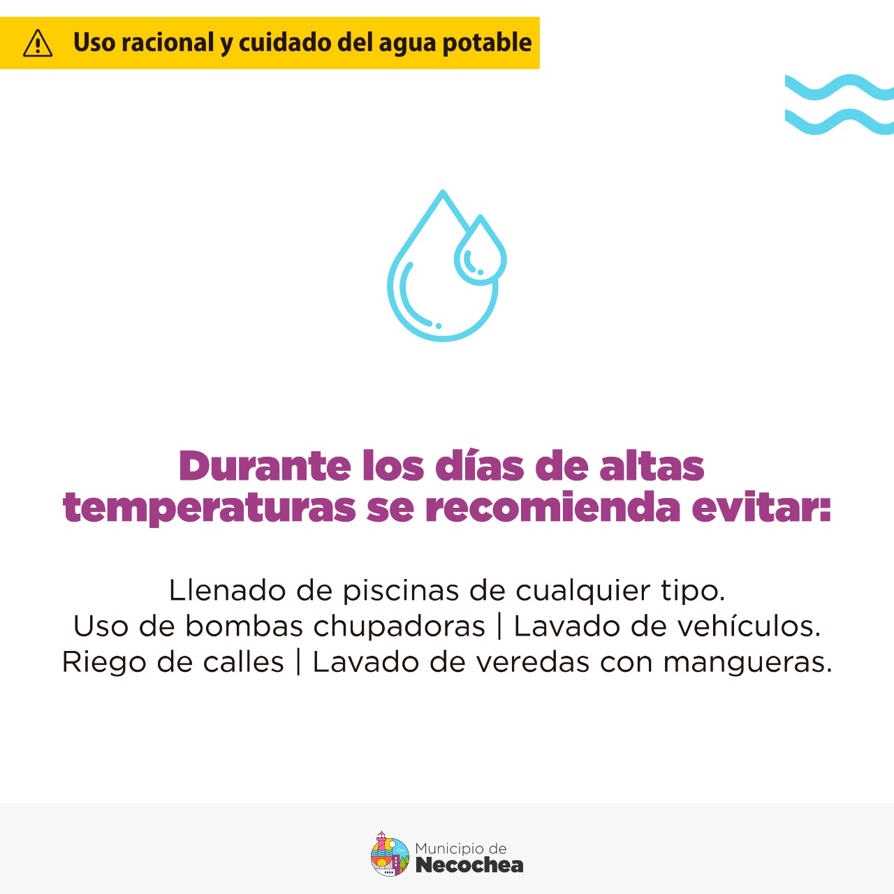 En estos días de intenso calor, el municipio vuelve a hacer hincapié en la concientización del uso racional y cuidado del agua potable, teniendo en cuenta que es un recurso no renovable y su consumo es muy elevado durante la temporada.