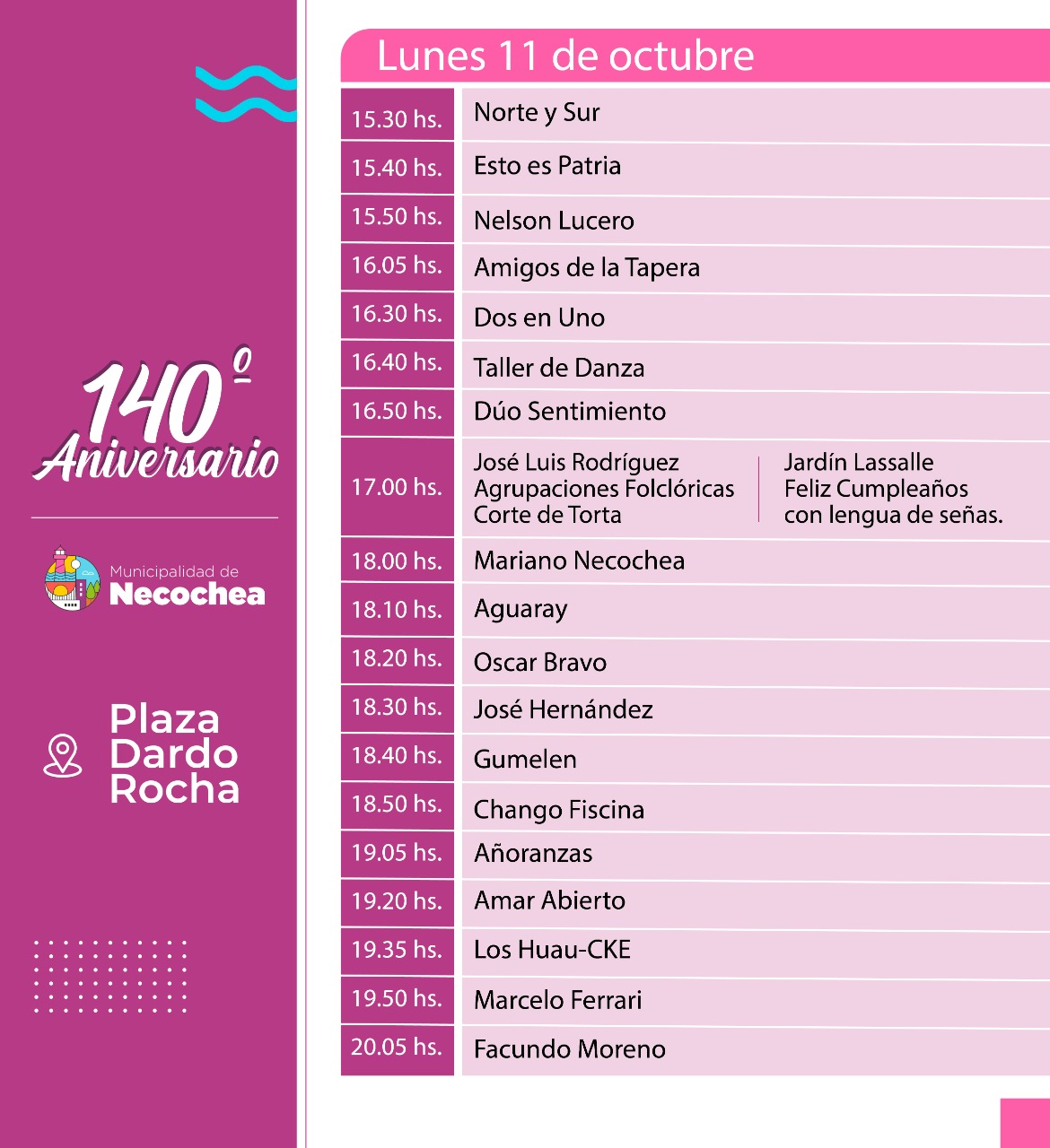 Solo por mencionar algunos a modo de ejemplo, el viernes estarán pisando las tablas la Escuela Provincial de Artes “Orillas del Quequén”, el Instituto Gesualdi o La Pachanga; el sábado harán lo propio el Payaso Abelardo, Alma Pacha, Pedro Guevara y la Yunta Sabrosa, Priscila Suárez y José Luis Rodríguez; el domingo saldrán a escena La Previa, Los Trasnochados y Los Borbotones; y el lunes Añoranzas, Marcelo Ferrari, Facundo Moreno y múltiples agrupaciones tradicionales, en un cierre a puro folclore.