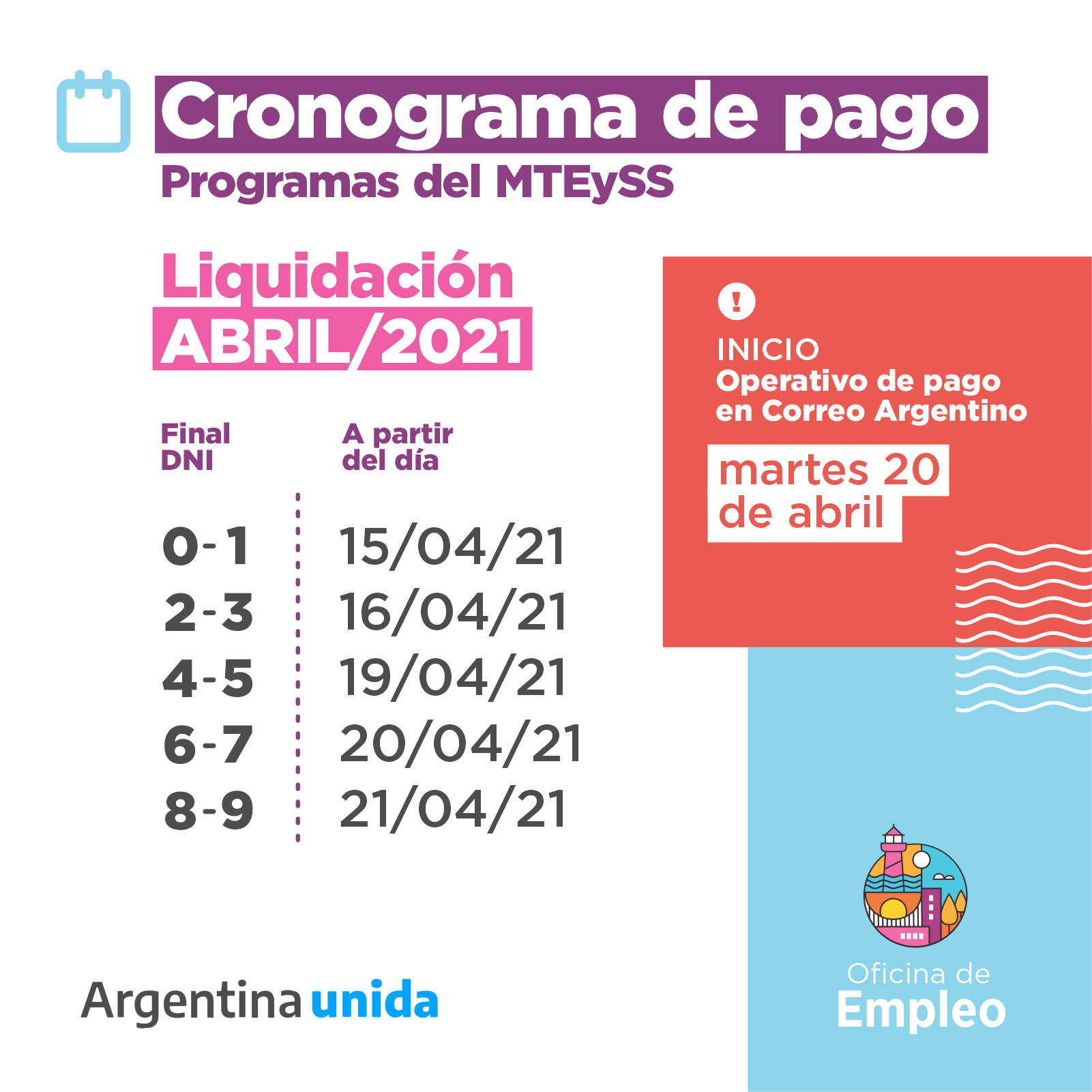 Las cancelaciones de los beneficios que impulsa el Ministerio de Trabajo, Empleo y Seguridad Social de la Nación, correspondientes al mes próximo pasado, comenzarán a abonarse el próximo 15 de abril.