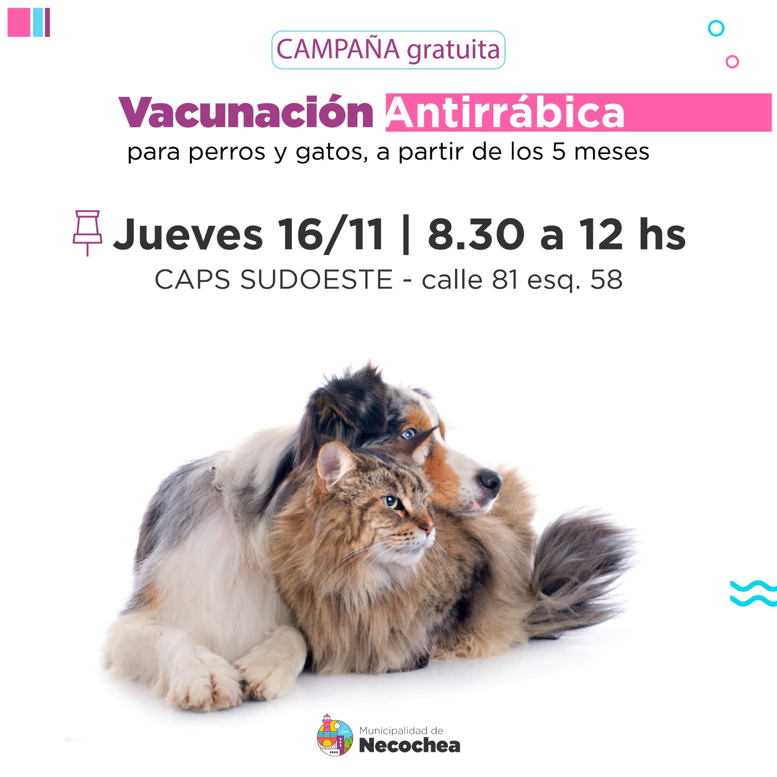 La campaña gratuita de prevención se realizará el próximo jueves 16 de noviembre, en el horario de 8:30 a 12. Las dosis pueden aplicarse a perros y gatos con buen estado de salud, a partir de los 5 meses de edad.