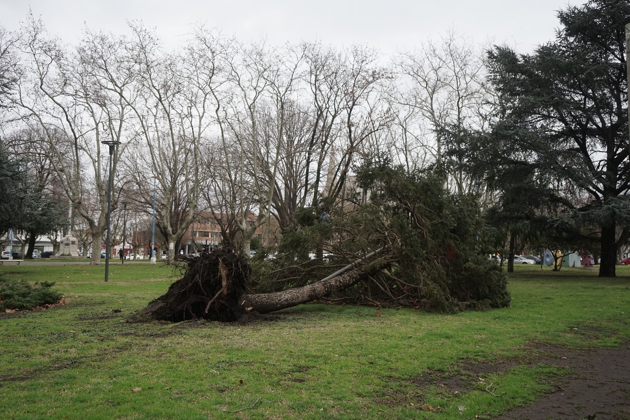 El paso del temporal de esta semana dejó daños en la vía pública y uno de los ejemplares arbóreos que resultó derribado por los fuertes vientos fue el pino de la Plaza Dardo Rocha que cada año se decora desde la Dirección de Cultura como arbolito de Navidad.