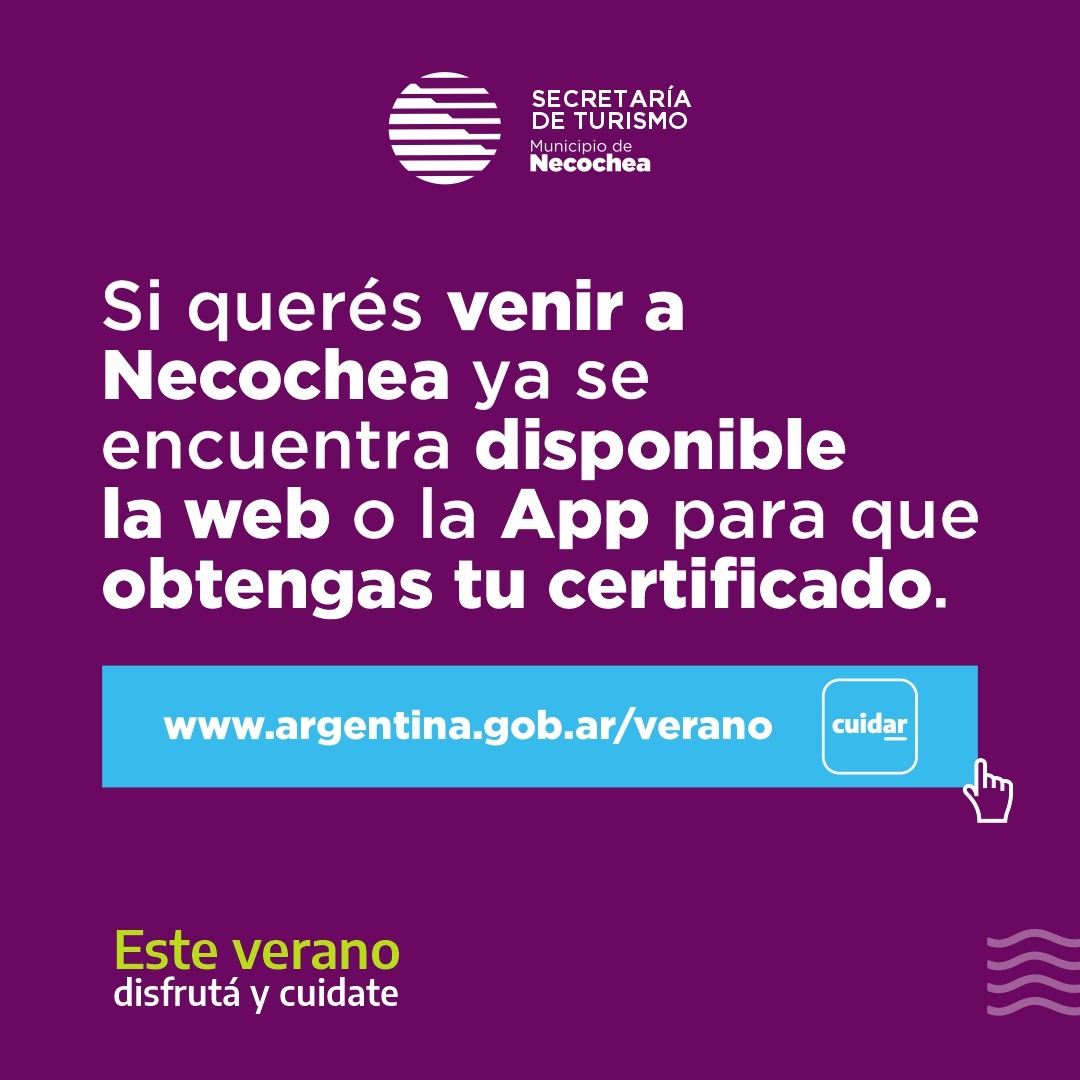 La Secretaría de Turismo de la Municipalidad de Necochea informa que ya está disponible la posibilidad del ingreso de turistas a nuestro distrito y para ello se deberá gestionar el permiso desde la página www.argentina.gob.ar/verano o en la aplicación CUIDAR.